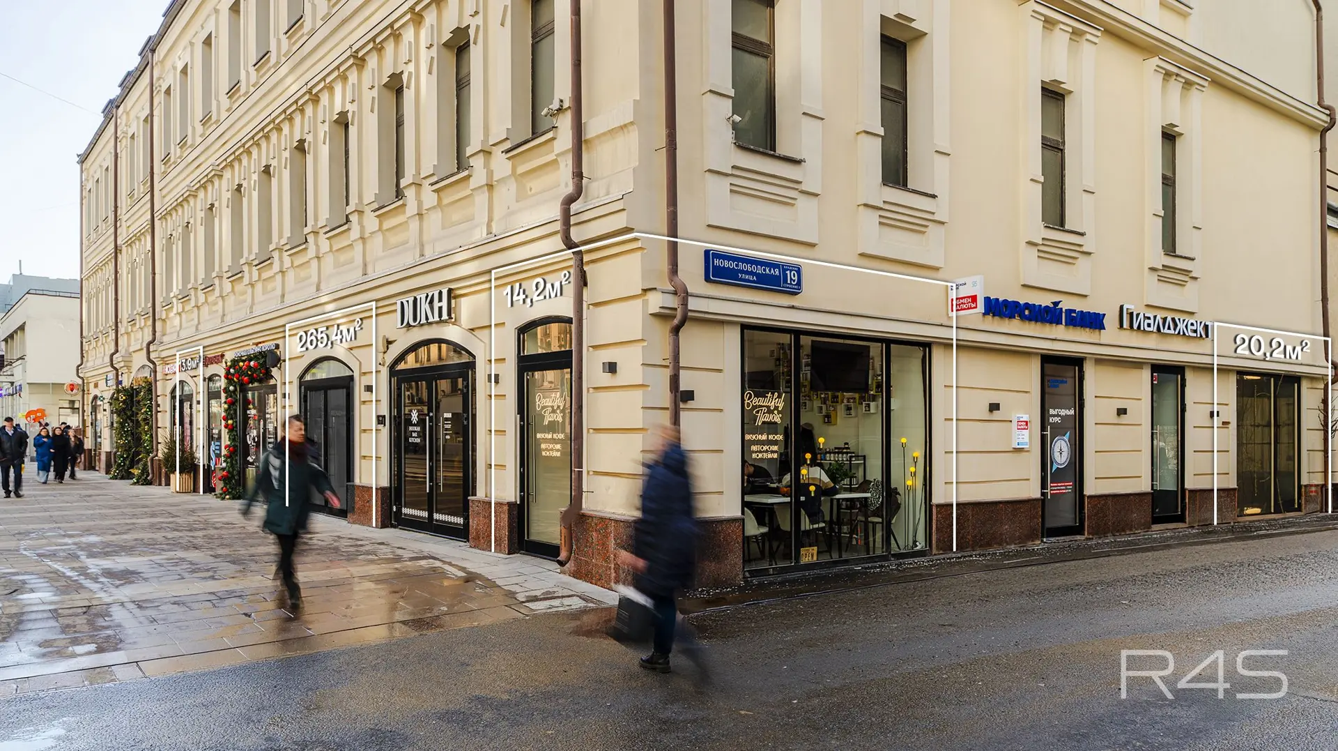 Торговые помещения расположены на первой фасадной линии Новослободской улицы, в 70 метрах от станций метро «Менделеевская» и «Новослободская».